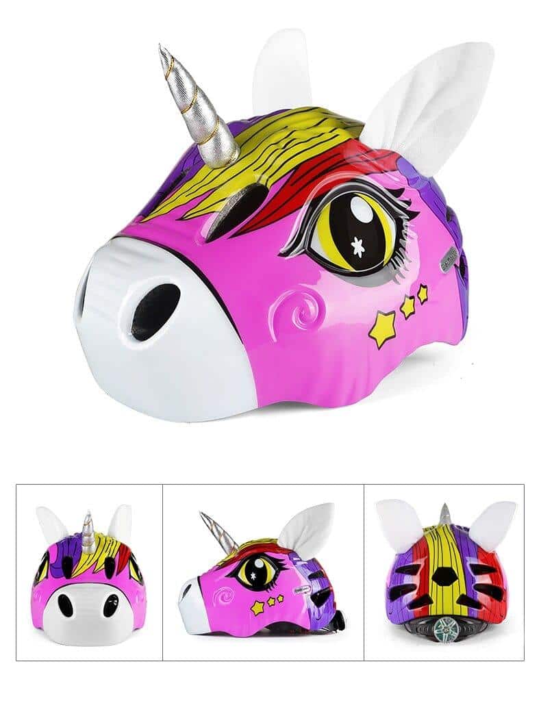 Denna cykelhjälm med 3D-enhörning är en söt och funktionell accessoar för barn. Den är tillverkad av mjuk och lätt plast, så den är bekväm att bära. Hjälmen har ett justerbart pannband och bakre klämma som gör det enkelt att anpassa den till ditt barns storlek. De mjuka öronkåporna i plysch ger extra komfort. Hjälmen har också ett reflekterande pannband som gör att den syns i mörkret.