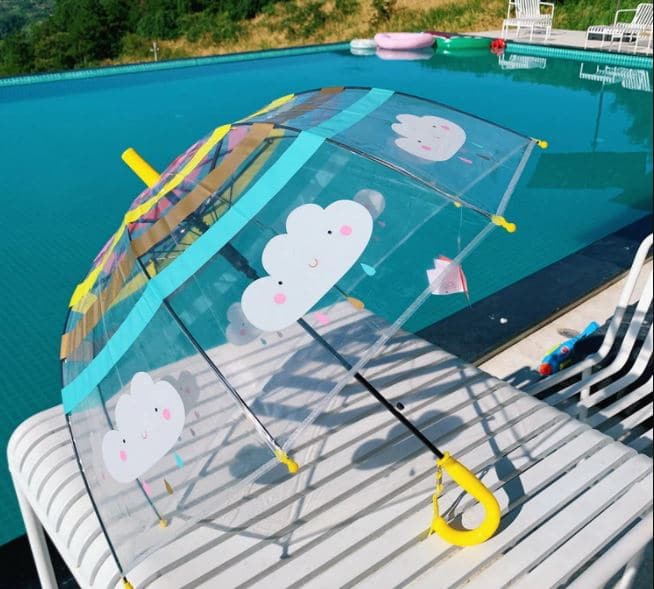 Kolla in det här söta transparenta paraplyet med regnbågs- och molnmotiv. Ett färgglatt och lättanvänt barnparaply. Detta paraply med sockerrörshandtag är lätt och robust. Det är perfekt för barn på dagis.