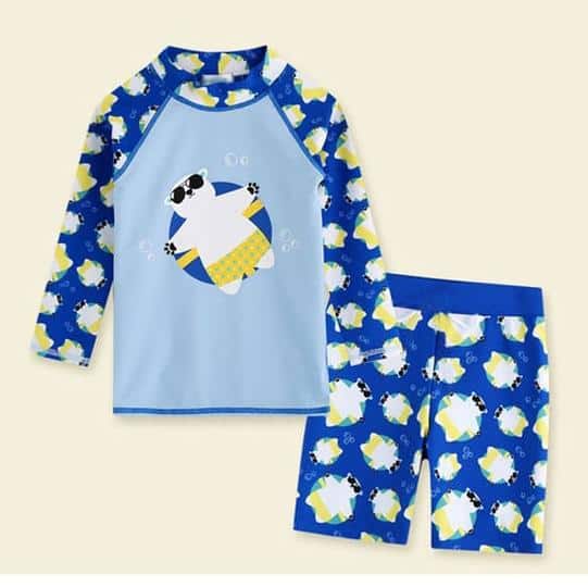 Baddräkt med blå björn och solglasögon för barn med shorts och t-shirt
