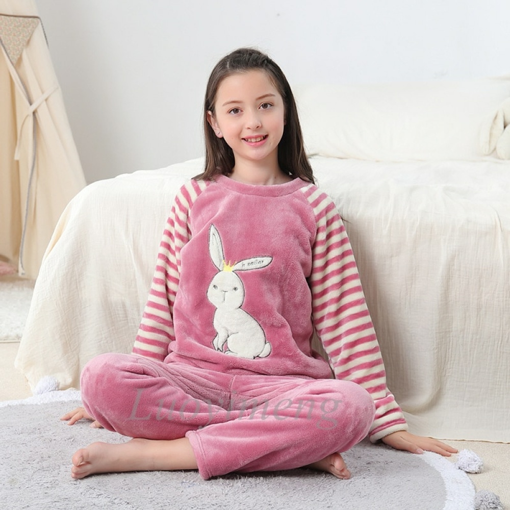 Fleecepyjamasen består av en långärmad topp med rund hals och tryckknappsfäste samt långbyxor med resår i midjan. Toppen har ett sött kaninmotiv på framsidan, medan byxorna är enfärgade. Pyjamasen är tillverkad i mjukt och varmt fleecematerial, perfekt för kalla vinterkvällar.