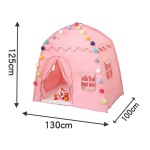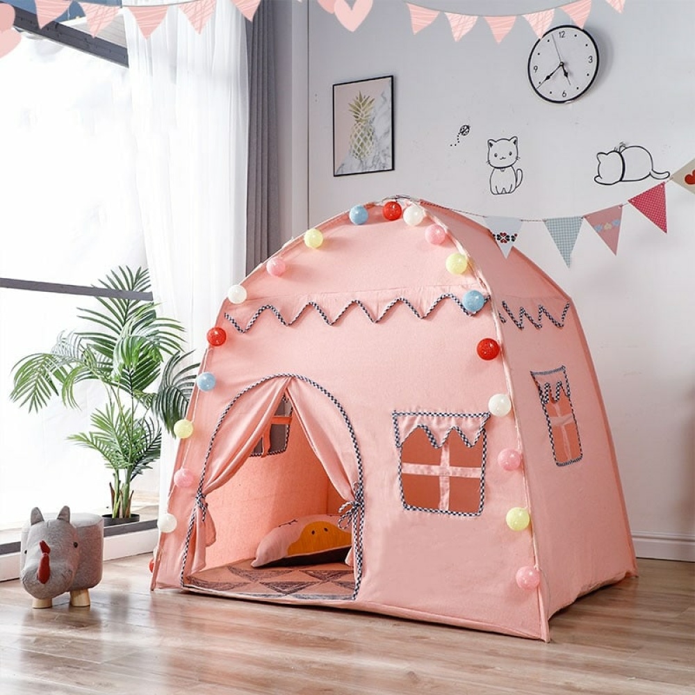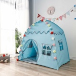 Tipi i form av ett färgglatt barnhus. Mycket rymligt, med 1 dörr och 3 fönster. Barnen kan stå upp inuti och placera tillbehör, kuddar, bord och stolar inuti. Snygg dekoration med vågiga band ovanför fönstren och på taket.
