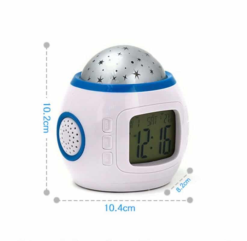 Denna LED-väckarklocka med mångfärgat stjärnljus är perfekt för både barn och vuxna! Den är enkel att använda och skapar en magisk atmosfär i ditt sovrum. Väckarklockan tänds automatiskt när du trycker på knappen och projicerar färgglada stjärnor i taket eller på väggarna. Du kan också justera ljusets färg och strålens intensitet. Väckarklockan drivs med AAA-batterier.
