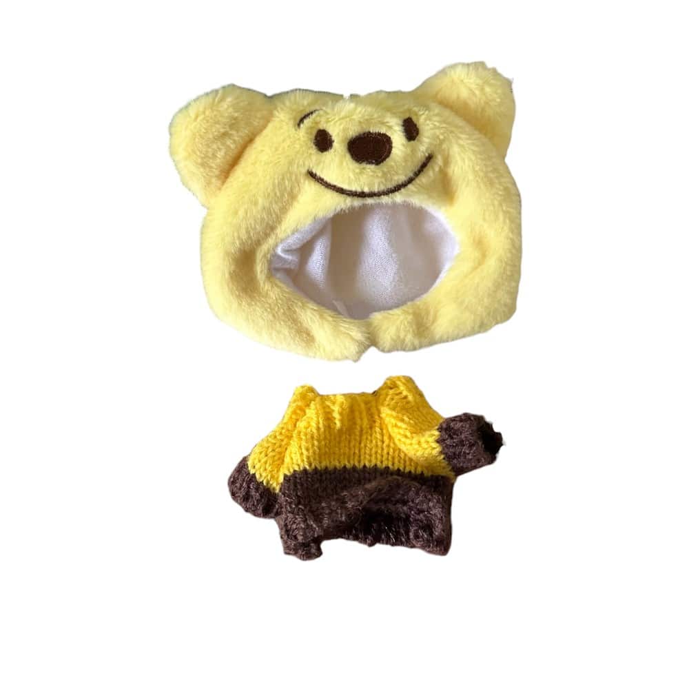 De här kläderna för Labubu-gosedjur i Nalle Puh-stil förvandlar gosedjuret till en söt liten björn. Med en mjuk gul huva och en stickad tröja i varma färger väcks barnets fantasi. Varje stund blir fylld av lek, glädje, värme, kreativitet och mysiga äventyr i vardagen.