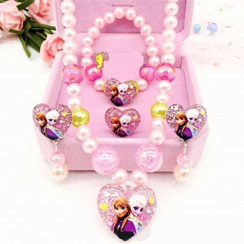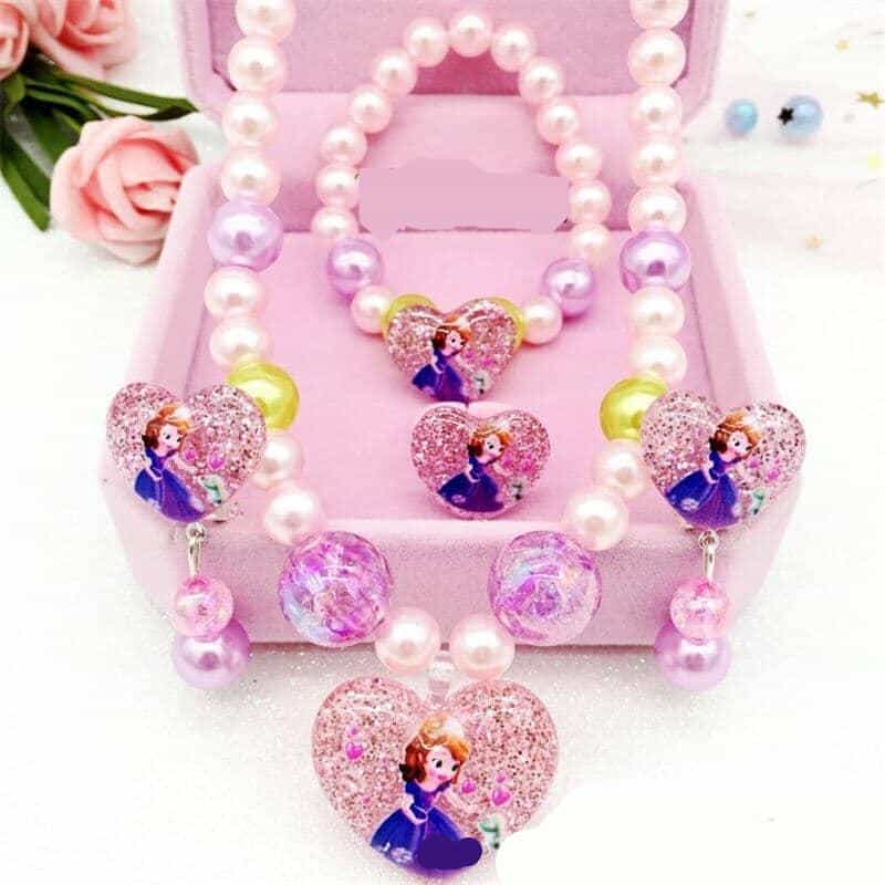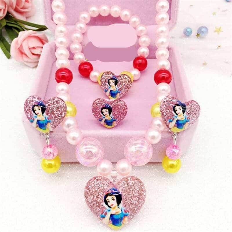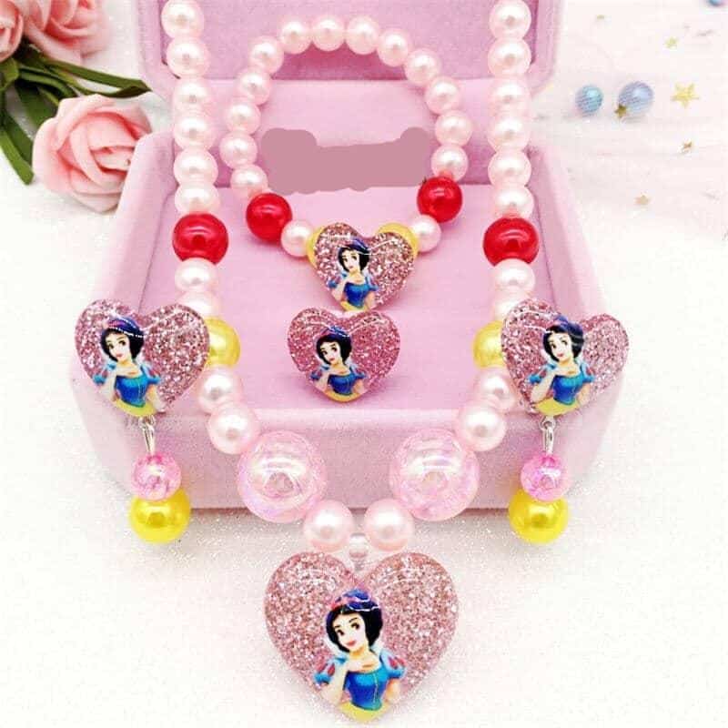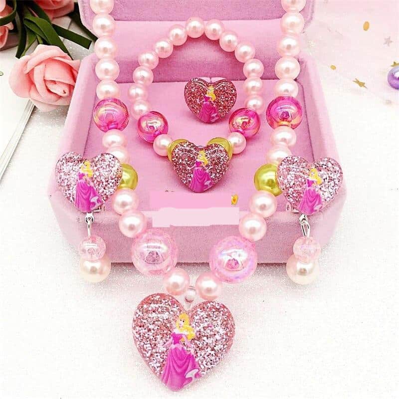 En sublim uppsättning smycken med Disney-motiv och ett hjärtformat hänge för små prinsessor. Denna ask innehåller en ring, ett halsband, ett armband och örhängen. Ett komplett smycke till din dotters ceremoni. Dessa smycken för flickor kommer också att vara perfekta för en temakväll.