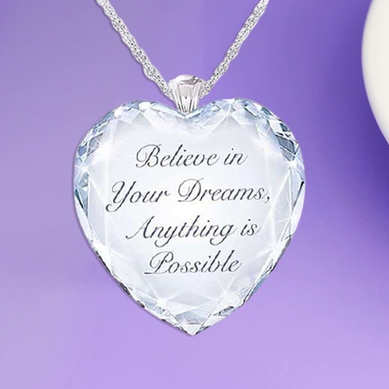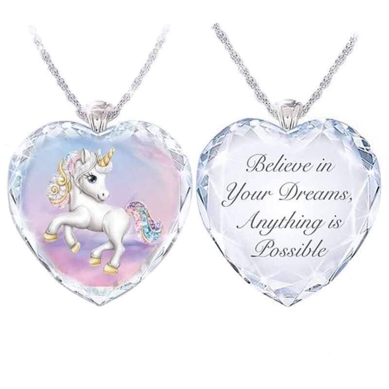 Upptäck vårt fantastiska halsband för flickor! Enhörningshänget är tillverkat av högkvalitativ kristall, vilket ger det en gnistrande glans och oöverträffad briljans. Dess fina, omsorgsfullt utformade form gör att det lilla fantasidjuret kommer till liv framför dina ögon. Ena sidan föreställer enhörningen, medan den andra visar en fras som säger att man ska tro på sina drömmar och att allt är möjligt!