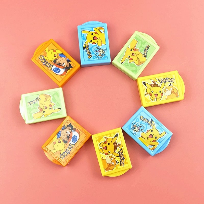 Den kommer med ett suddgummi, denna magiska låda med Pikachu, den har flera färger, men du kan inte välja, överraskningen är att veta vilken färg din låda kommer att ha.